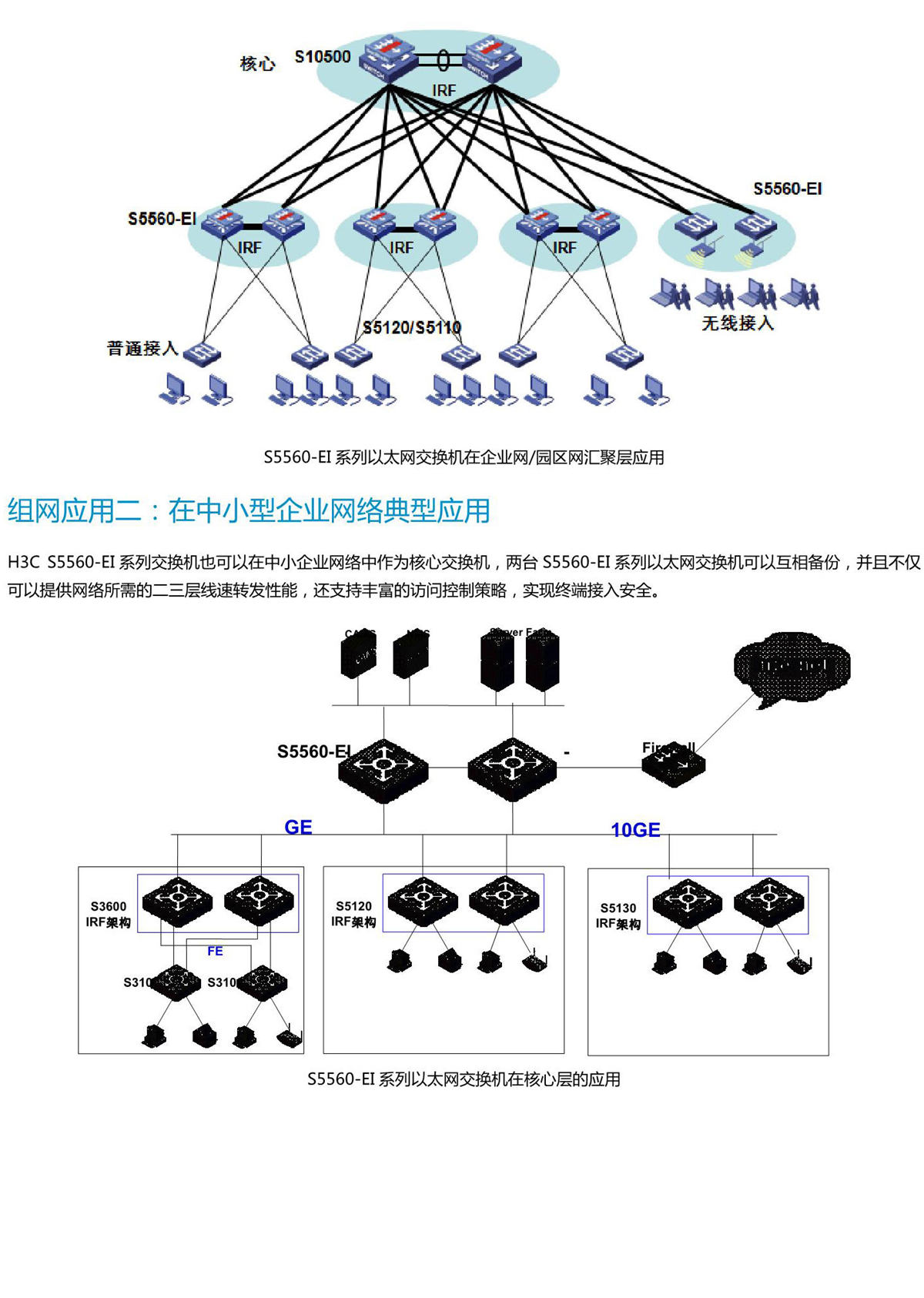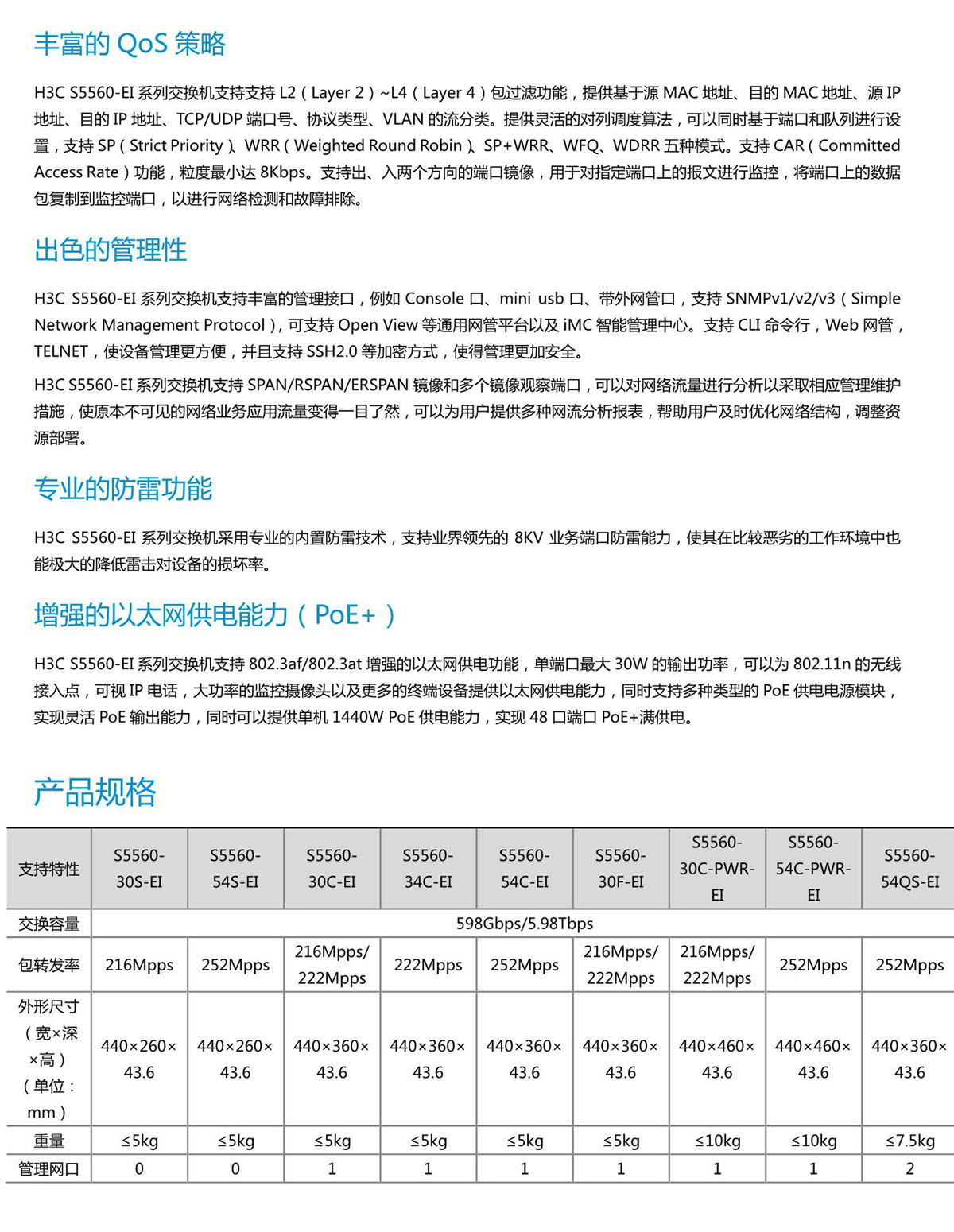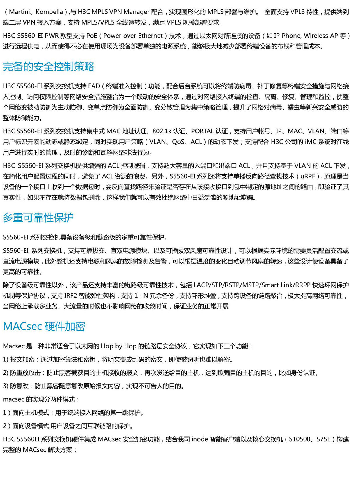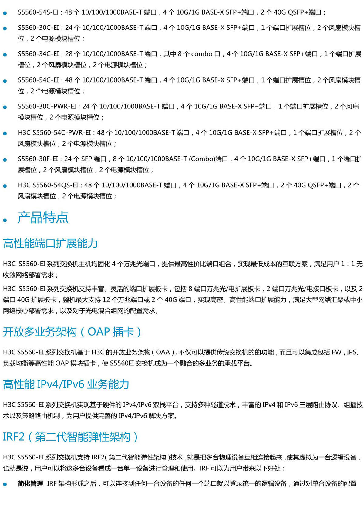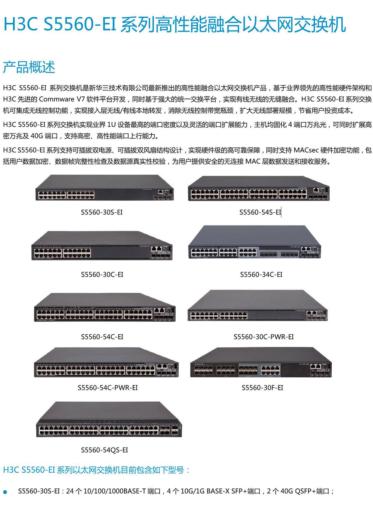 H3C S5560-EI系列交換機是新華三技術有限公司最新推出的高性能融合以太網交換機産品,基于業界領先的高性能硬件(jiàn)架構和H3C先進的Commware V7軟件(jiàn)平台開發,同時基于強大(dà)的統一交換平台,實現有線無線的無縫融合。H3C S5560-EI系列交換機可(kě)集成無線控制功能,實現接入層無線/有線本地轉發,消除無線控制帶寬瓶頸,擴大(dà)無線部署規模,節省用戶投資成本。 H3C S5560-EI系列交換機實現業界1U設備最高的端口密度以及靈活的端口擴展能力,主機均固化4端口萬兆光(guāng),可(kě)同時擴展高密萬兆及40G端口,支持高密、高性能端口上行能力。 H3C S5560-EI系列支持可(kě)插拔雙電源、可(kě)插拔雙風扇結構設計,實現硬件(jiàn)級的高可(kě)靠保障,同時支持MACsec硬件(jiàn)加密功能,包括用戶數據加密、數據幀完整性檢查及數據源真實性校(xiào)驗,爲用戶提供安全的無連接MAC層數據發送和接收服務。