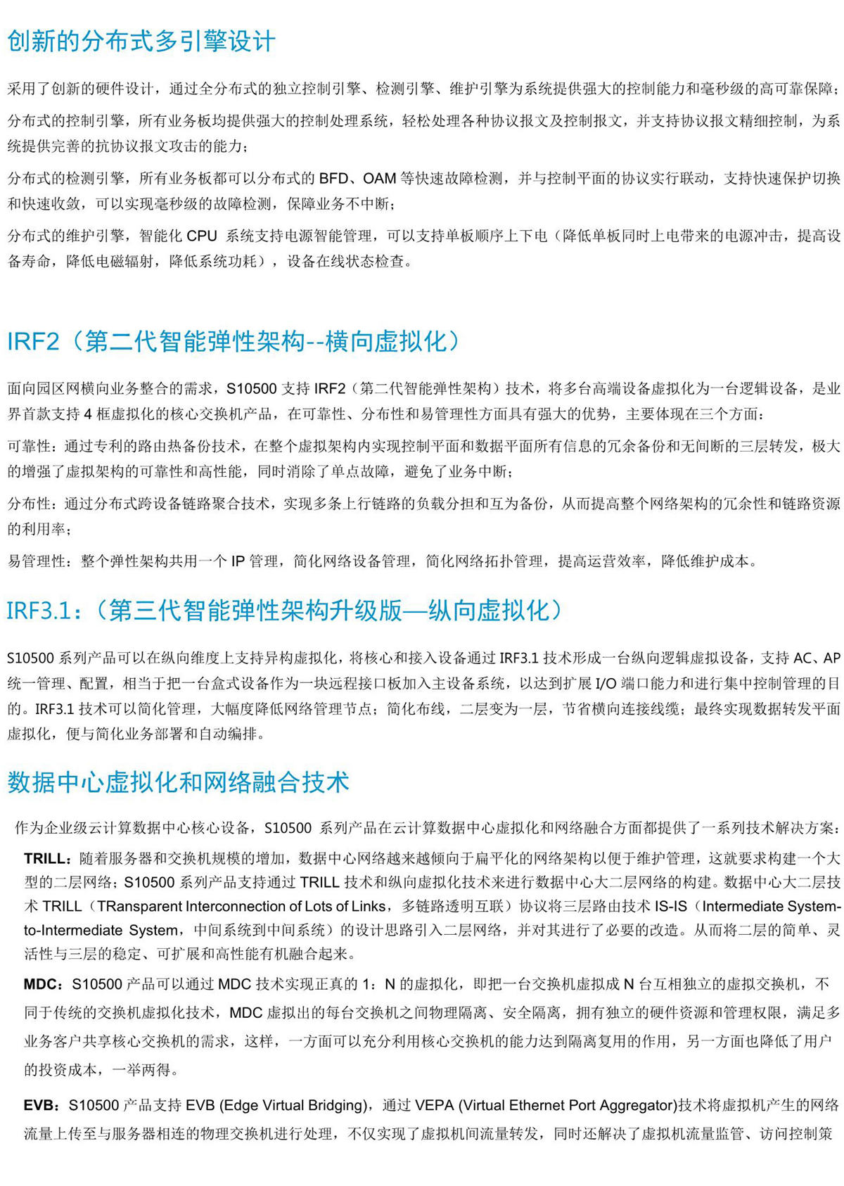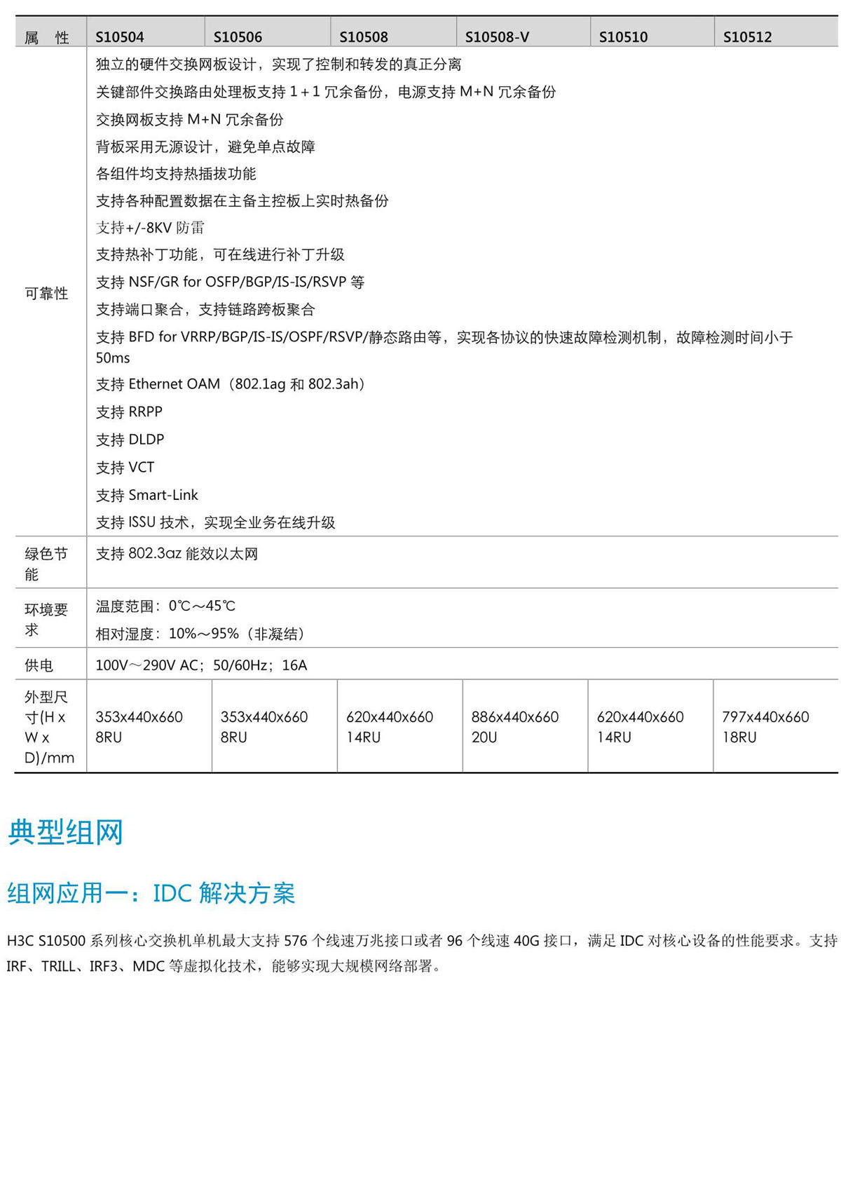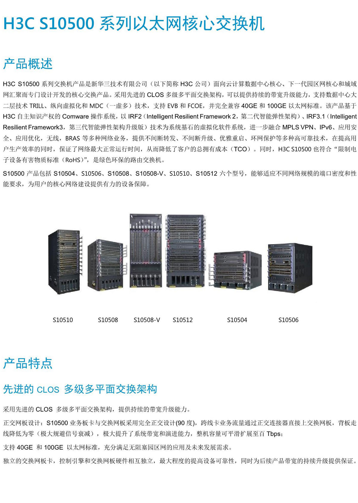 H3C S10500系列交換機産品是新華三技術有限公司(以下簡稱H3C公司)面向雲計算數據中心核心、下一代園區網核心和城(chéng)域網彙聚而專門設計開發的核心交換産品。采用先進的CLOS多級多平面交換架構,可(kě)以提供持續的帶寬升級能力,支持數據中心大(dà)二層技術TRILL、縱向虛拟化和MDC(一虛多)技術,支持EVB和FCOE,并完全兼容40GE和100GE以太網标準。該産品基于H3C自(zì)主知識産權的Comware操作(zuò)系統,以IRF2(Intelligent Resilient Framework 2,第二代智能彈性架構)、IRF3.1(Intelligent Resilient Framework3,第三代智能彈性架構升級版)技術爲系統基石的虛拟化軟件(jiàn)系統,進一步融合MPLS VPN、IPv6、應用安全、應用優化,無線,BRAS等多種網絡業務,提供不間斷轉發、不間斷升級、優雅重啓、環網保護等多種高可(kě)靠技術,在提高用戶生(shēng)産效率的同時,保證了網絡最大(dà)正常運行時間,從而降低了客戶的總擁有成本(TCO)。同時,H3C S10500也符合“限制電子設備有害物質标準(RoHS)”,是綠色環保的路(lù)由交換機。 S10500産品包括S10504、S10506、S10508、S10508-V、S10510、S10512六個型号,能夠适應不同網絡規模的端口密度和性能要求,爲用戶的核心網絡建設提供有力的設備保障。