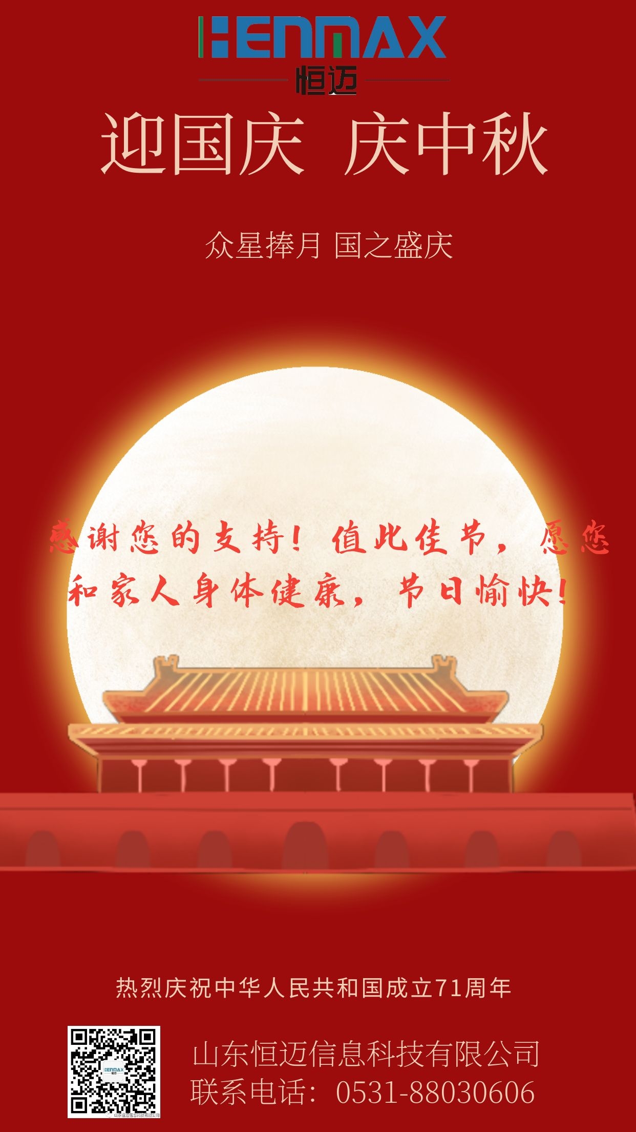 值此國慶、中秋雙節,山(shān)東恒邁信息科(kē)技有限公司的全體員工(gōng)祝所有合作(zuò)夥伴國慶中秋雙節快(kuài)樂,一心一意的支持陪伴,接二連三的合作(zuò)美滿,四書五經的學習不斷,六出奇計的輝煌呈現,七竅玲珑的謀略高瞻,八拜之交的情誼康健,久久依偎的相(xiàng)互扶攙,十全十美的真誠不變。一生(shēng)的緣,祝平安健康,幸福連連。