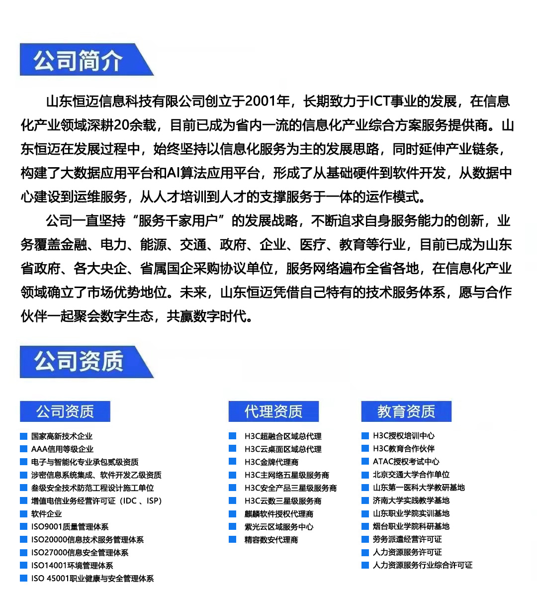 山(shān)東恒邁自(zì)2001年(nián)成立以來,始終堅持“服務千家用戶”的發展戰略,攜手新華三,不斷追求自(zì)身(shēn)服務能力的創新,先後成爲華三商業金牌代理(lǐ)商、行業金牌代理(lǐ)商、主網絡五星級服務商、雲智山(shān)東省區域總代等。
