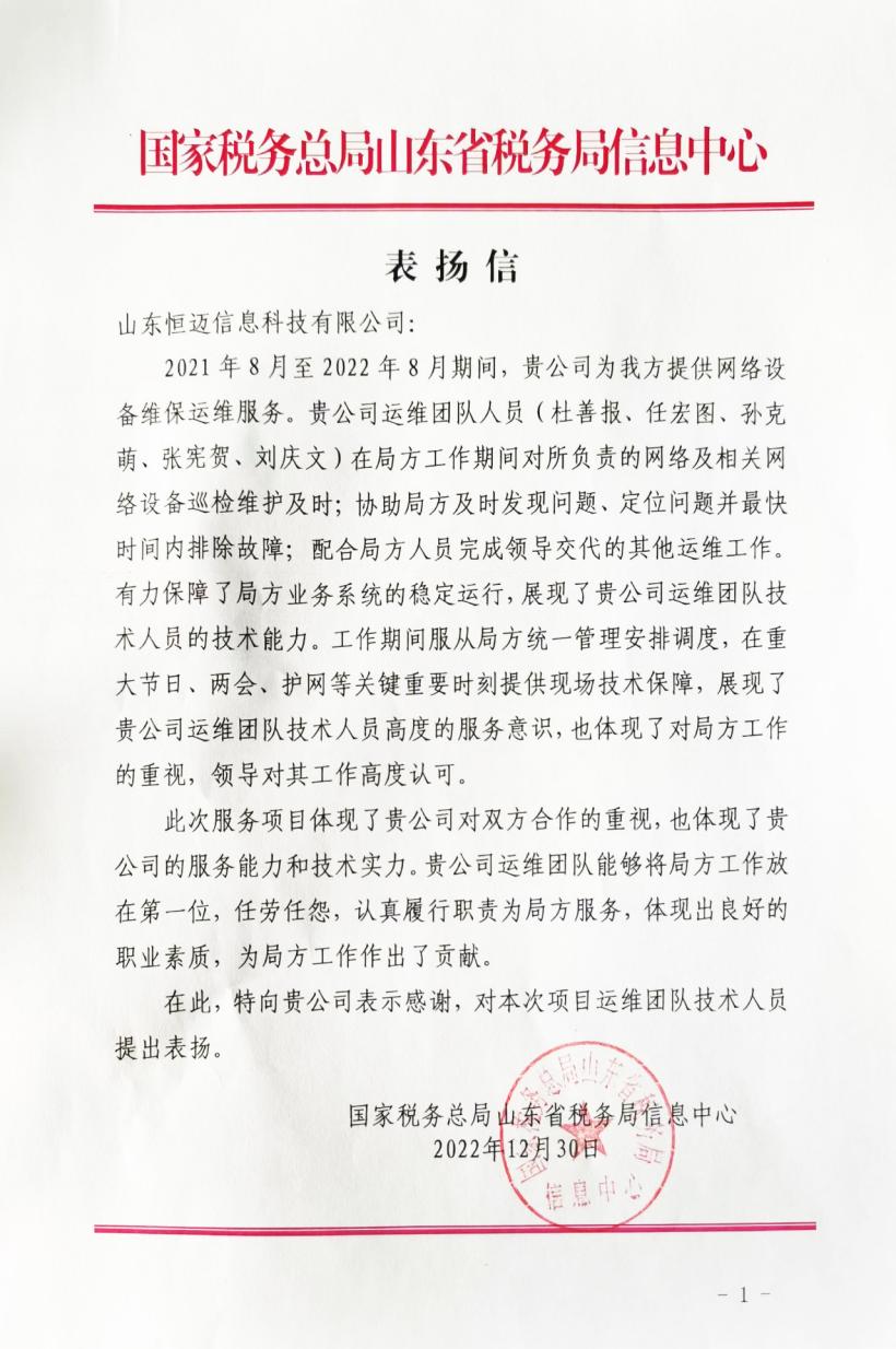 2022年(nián)12月30日(rì),國家稅務總局山(shān)東省稅務局信息中心發來感謝信,信中充分(fēn)肯定了山(shān)東恒邁信息科(kē)技有限公司爲山(shān)東省稅務局網絡設備維保運維服務中展現出的高度責任感和專業的技術水平,對公司和員工(gōng)的辛勤付出表示衷心的感謝。