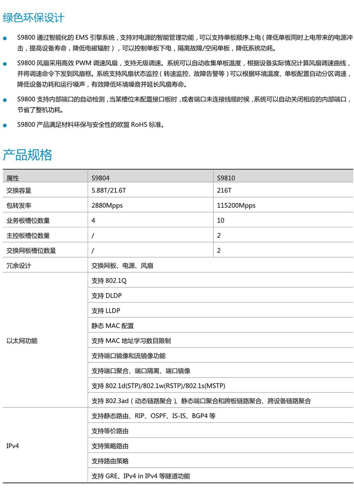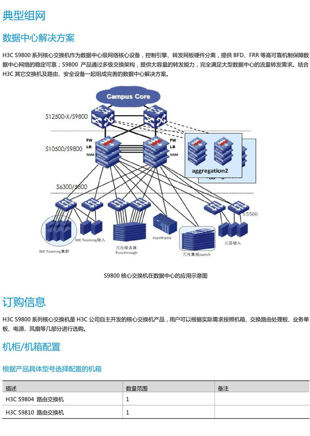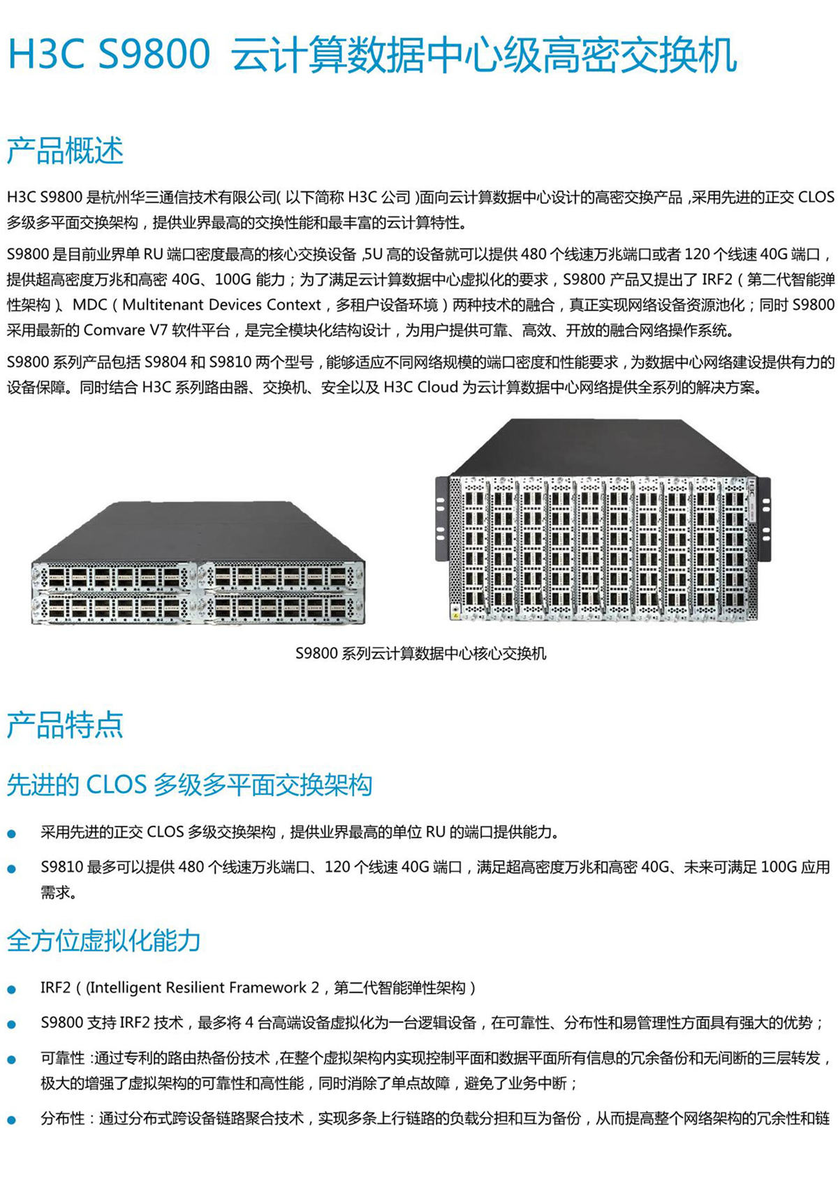 H3C S9800 系列交換機是H3C公司面向雲計算數據中心設計的高密交換産品,采用先進的正交CLOS多級多平面交換架構,提供業界最高的交換性能和最豐富的雲計算特性。 S9800是目前業界單RU端口密度最高的核心交換設備,5U高的設備就(jiù)可(kě)以提供240個線速萬兆端口或者120個線速40G端口,提供超高密度萬兆和高密40G、100G能力;爲了滿足雲計算數據中心虛拟化的要求,S9800産品又提出了IRF2(第二代智能彈性架構)、MDC(Multitenant Devices Context,多租戶設備環境)兩種技術的融合,真正實現網絡設備資源池化;同時S9800采用最新的Comvare V7軟件(jiàn)平台,是完全模塊化結構設計,爲用戶提供可(kě)靠、高效、開放(fàng)的融合網絡操作(zuò)系統。 S9800系列産品包括S9804和S9810兩個型号,能夠适應不同網絡規模的端口密度和性能要求,爲數據中心網絡建設提供有力的設備保障。同時結合H3C系列路(lù)由器、交換機、安全以及H3C Cloud爲雲計算數據中心網絡提供全系列的解決方案