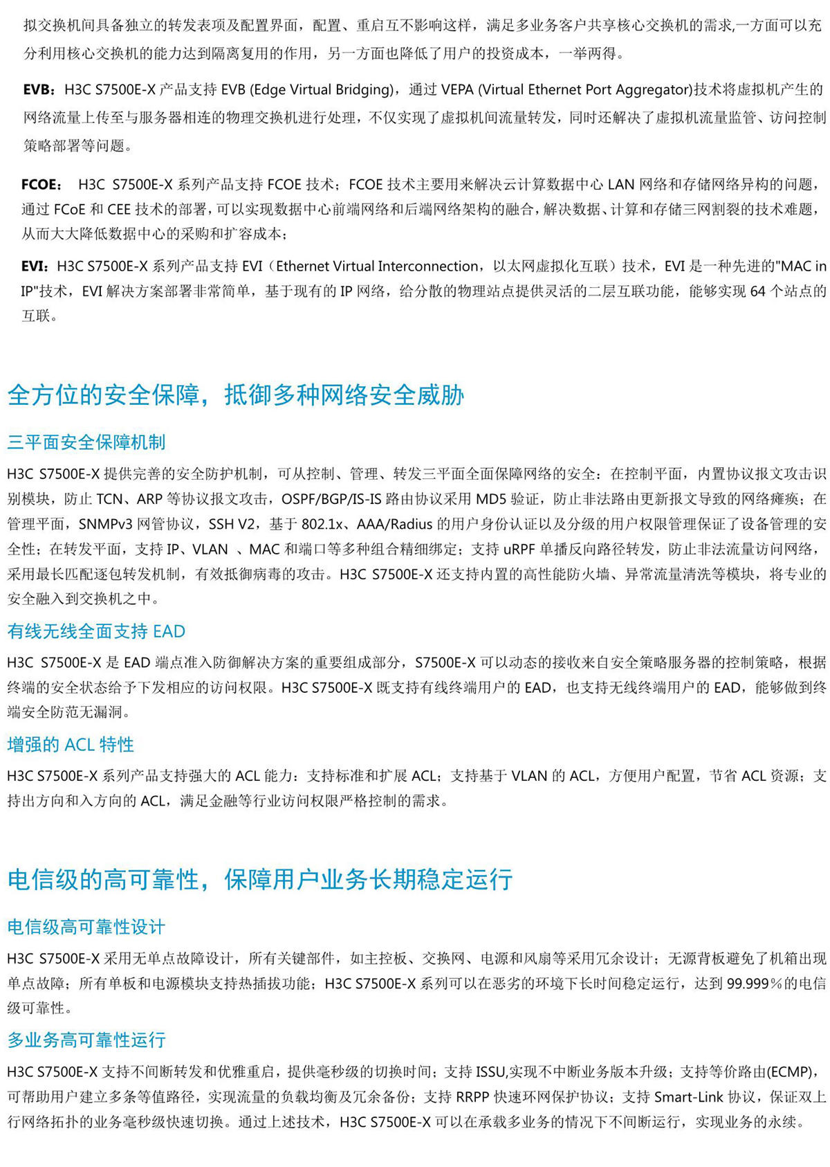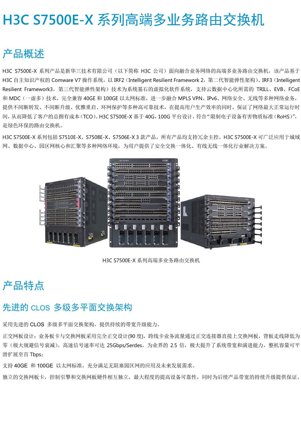 H3C S7500E-X系列産品是新華三技術有限公司(以下簡稱H3C公司)面向融合業務網絡的高端多業務路(lù)由交換機,該産品基于H3C自(zì)主知識産權的Comware V7操作(zuò)系統,以IRF2(Intelligent Resilient Framework 2,第二代智能彈性架構)、IRF3(Intelligent Resilient Framework3,第三代智能彈性架構)技術爲系統基石的虛拟化軟件(jiàn)系統,支持雲數據中心化所需的TRILL、EVB、FCoE和MDC(一虛多)技術,完全兼容40GE和100GE以太網标準,進一步融合MPLS VPN、IPv6、網絡安全、無線等多種網絡業務,提供不間斷轉發、不間斷升級、優雅重啓、環網保護等多種高可(kě)靠技術,在提高用戶生(shēng)産效率的同時,保證了網絡最大(dà)正常運行時間,從而降低了客戶的總擁有成本(TCO)。H3C S7500E-X基于40G,100G平台設計,符合“限制電子設備有害物質标準(RoHS)”,是綠色環保的路(lù)由交換機。